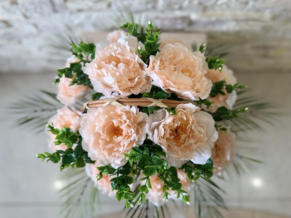 Прикрашений кошик з лози прикрашений півоніями та зелені